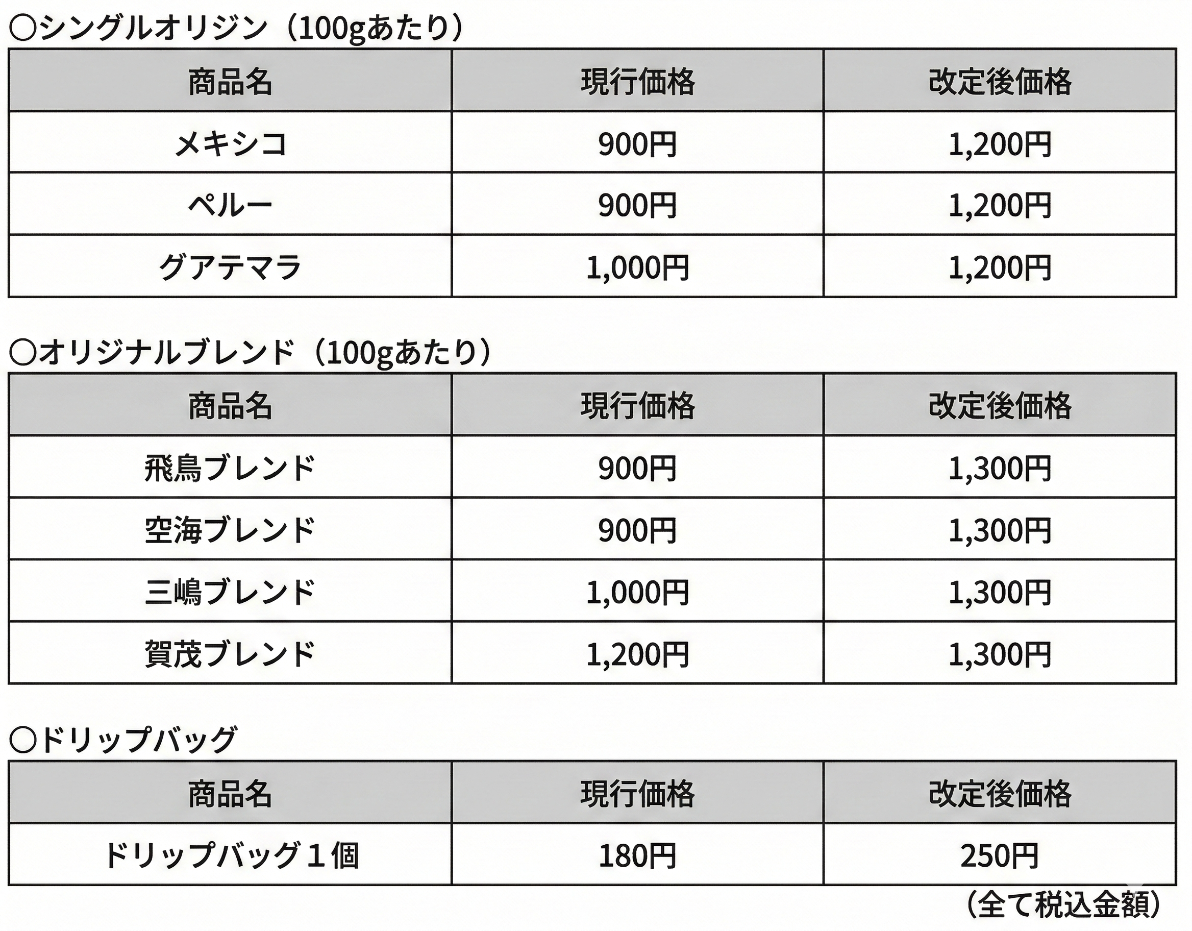 コーヒー豆 価格改定のご案内